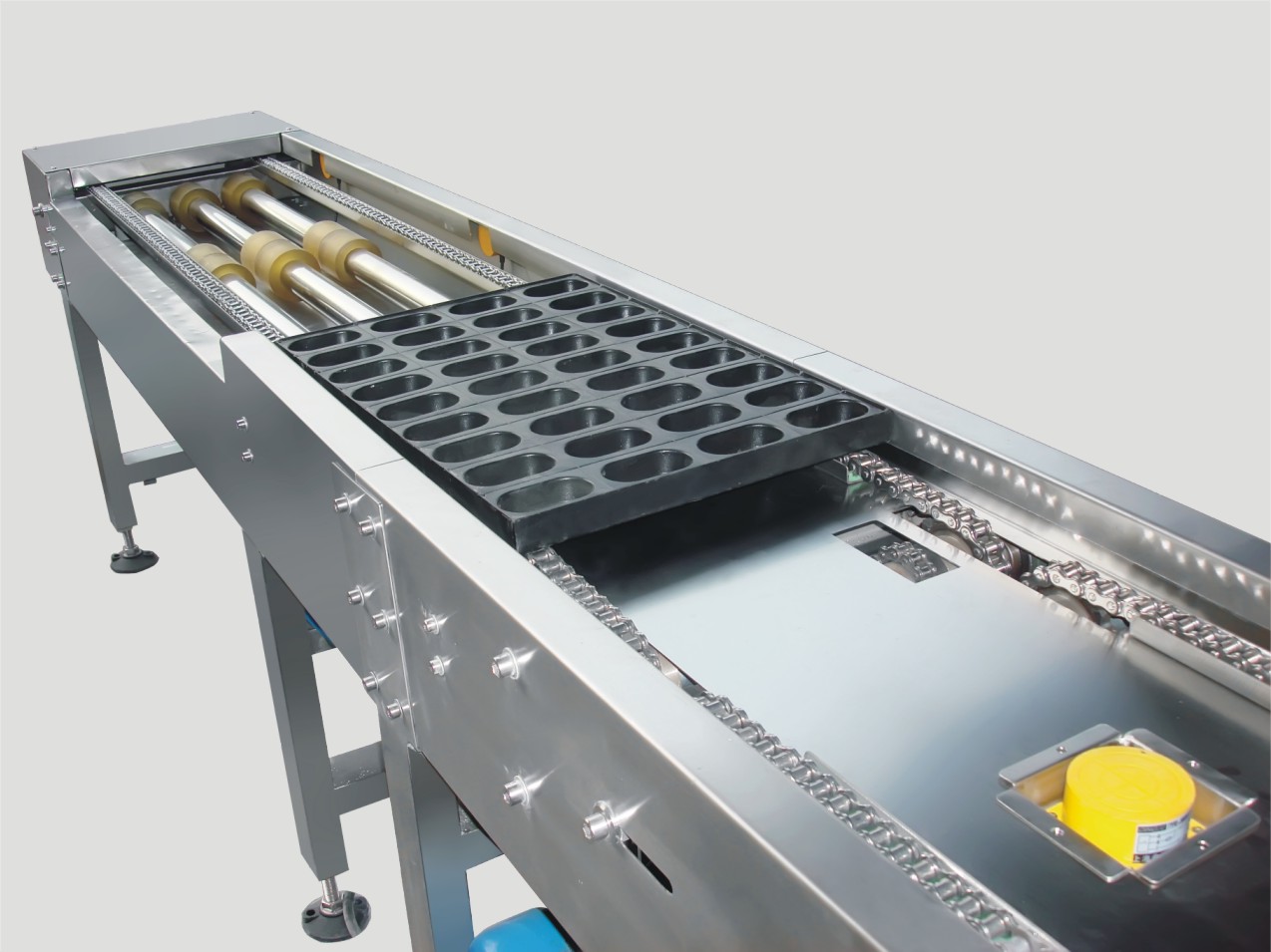 烤盘输送线分单盘、双盘、转弯输送等多种输送。输送带以不锈钢坦克链为主,以快速链条为辅组合而成。
