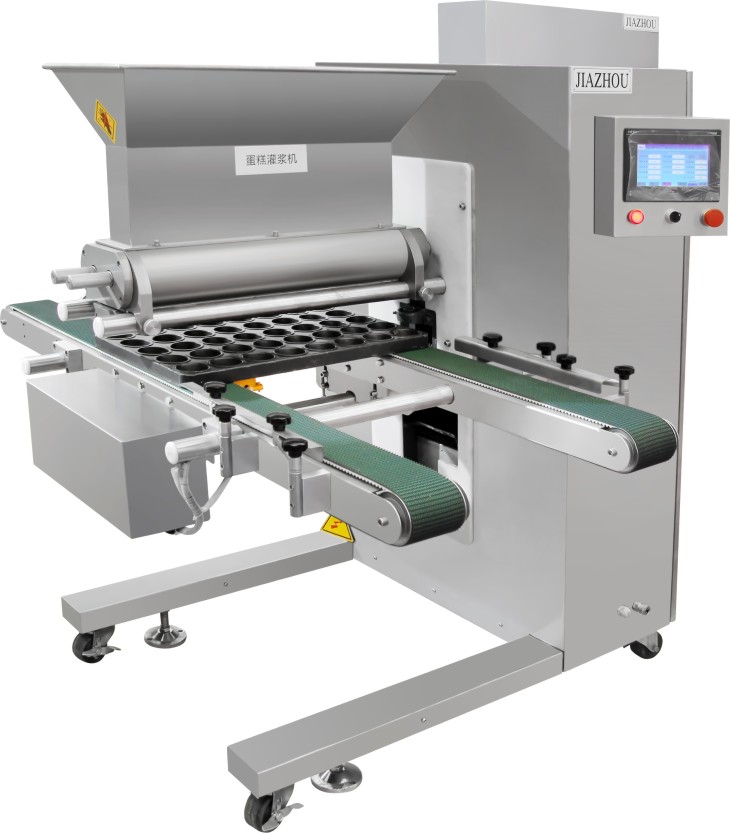 滚筒式注浆机采用滚筒反向旋转将浆料通过滚筒沟槽带出,出料口配有旋转开关装置,可以防止滴料。加装抹盘出料嘴可以生产切片蛋糕。
